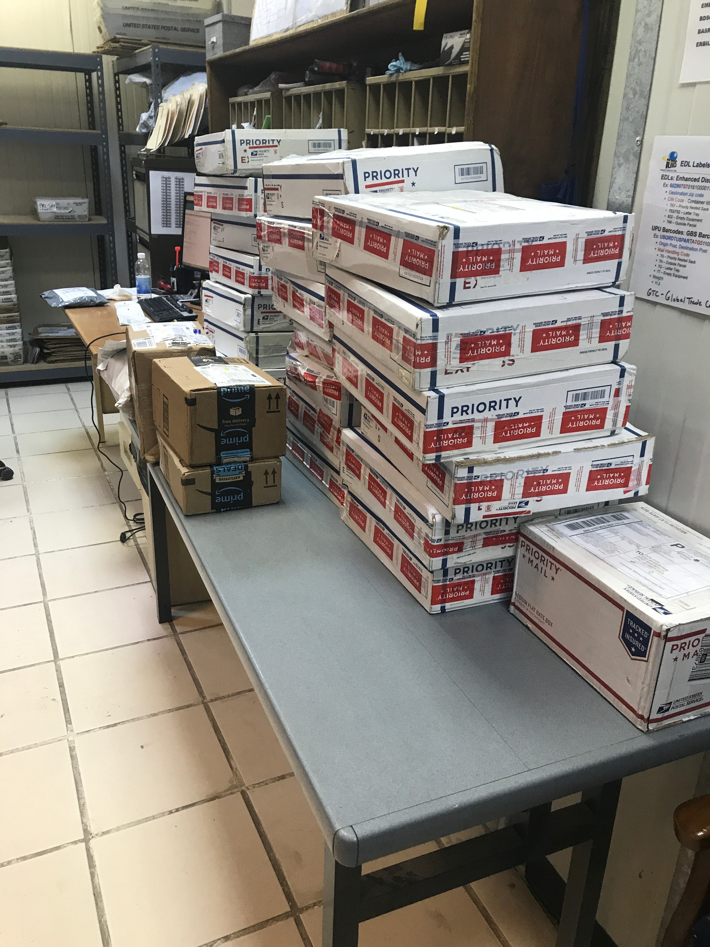 A hundred and twenty! Even the rumored 100 had been a lowball. I piled them — all red-white-and-blue Priority Mail boxes the size of a birthday cake — high in my dusty Suburban, texted the boys and escorted the precious cargo over the bumpy dirt roads to our team room across base.